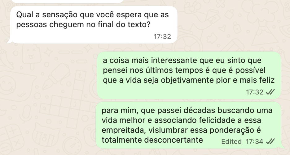 Uma amiga querida me perguntou qual a sensação eu espero que as pessoas tenham ao ler esse texto. Ela sugeriu que eu colocasse minha resposta por aqui e eu achei uma boa ideia.